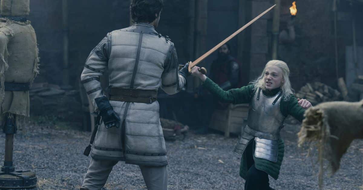 Transmitido unos días después, Casa del Dragón“The Princess and the Queen” de ‘s presenta un gran salto en el tiempo y un nuevo status quo. Como parte de su recorrido por cómo son las cosas ahora, el episodio hace una pausa para mostrar a las incorporaciones más jóvenes al elenco siendo entrenadas en el manejo de la espada por Ser Criston Cole, el antiguo amante (secreto) de la princesa Rhaenyra, mientras el rey Viserys y otros miembros de la corte observan. . Cuando el príncipe Aegon, el hijo mayor de la reina Alicent y el rey Viserys, se vuelve un poco engreído al entrenar muñecos, Criston lo desafía a entrenar con su maestro, con un poco de ayuda de su hermano. A diferencia de Galadriel en Los anillos del poderSer Criston no se está divirtiendo con sus alumnos, pero él es faltándoles el respeto, y de forma hilarante.